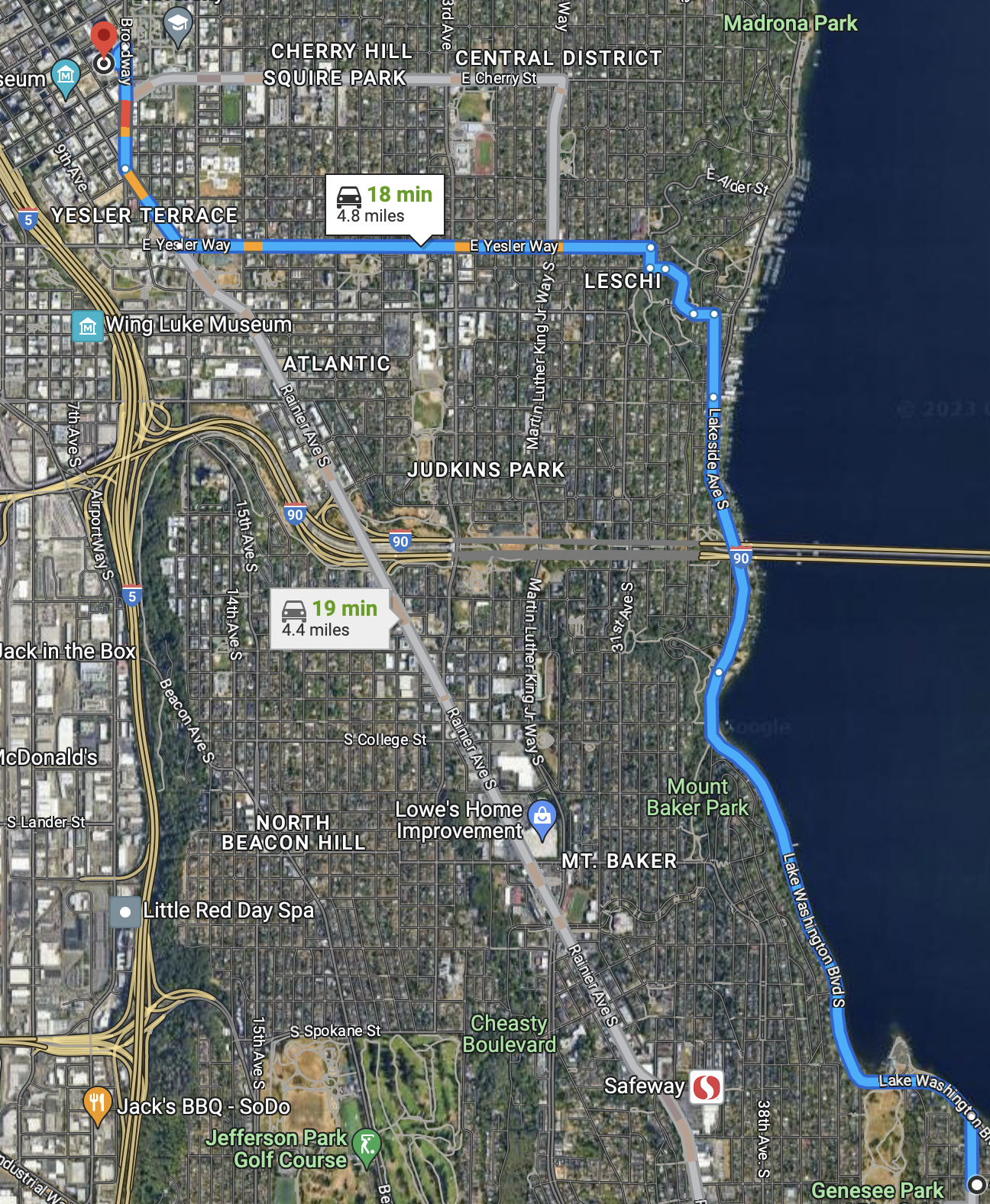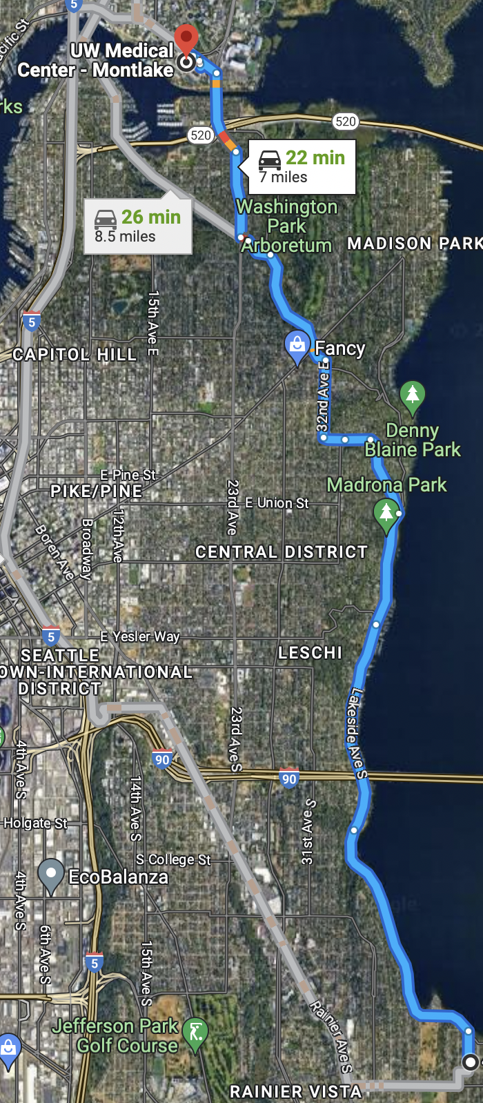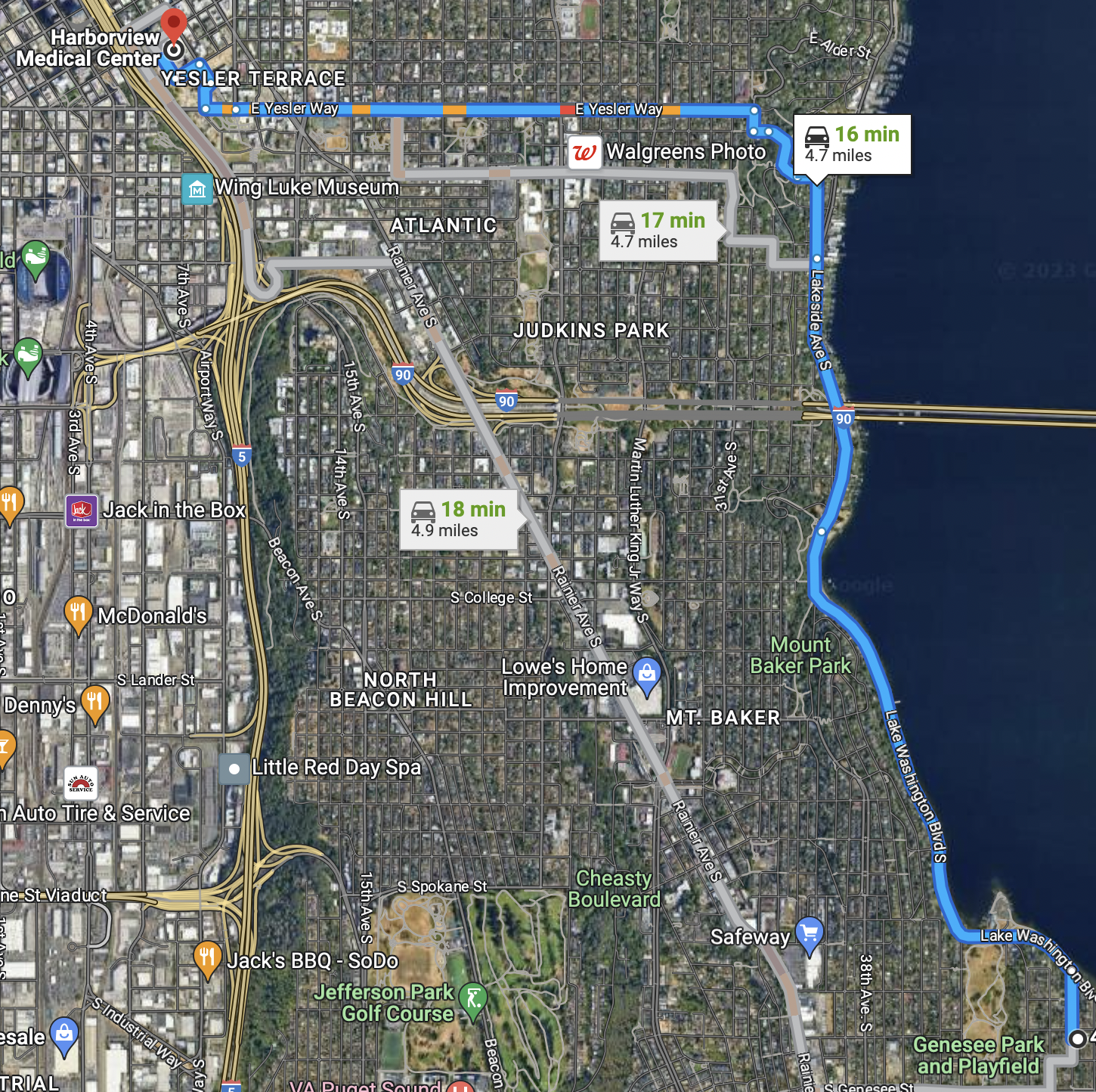 Harborview Medical Center, Seattle, WA—16 to 20 minutes (lakeside commute)