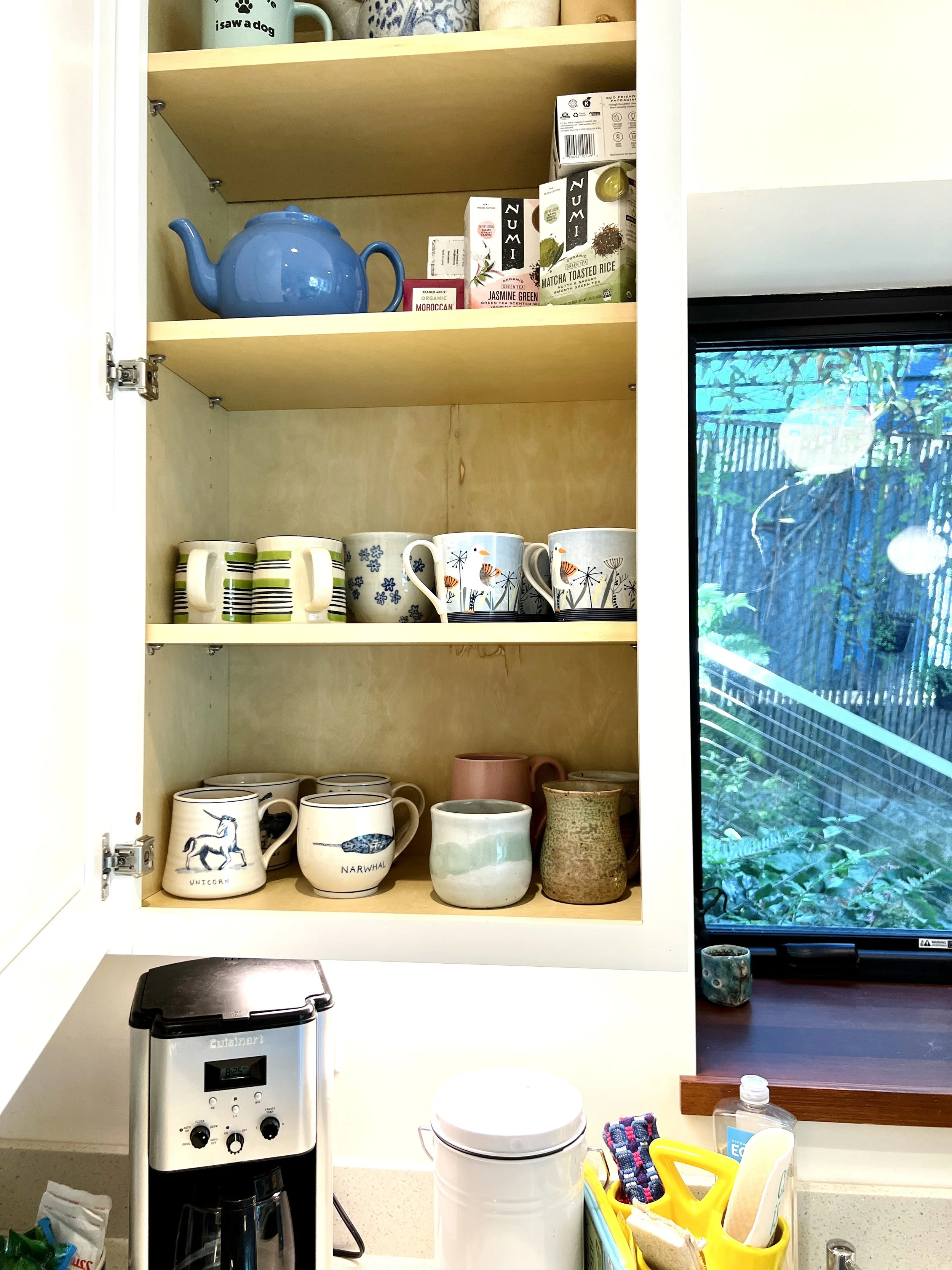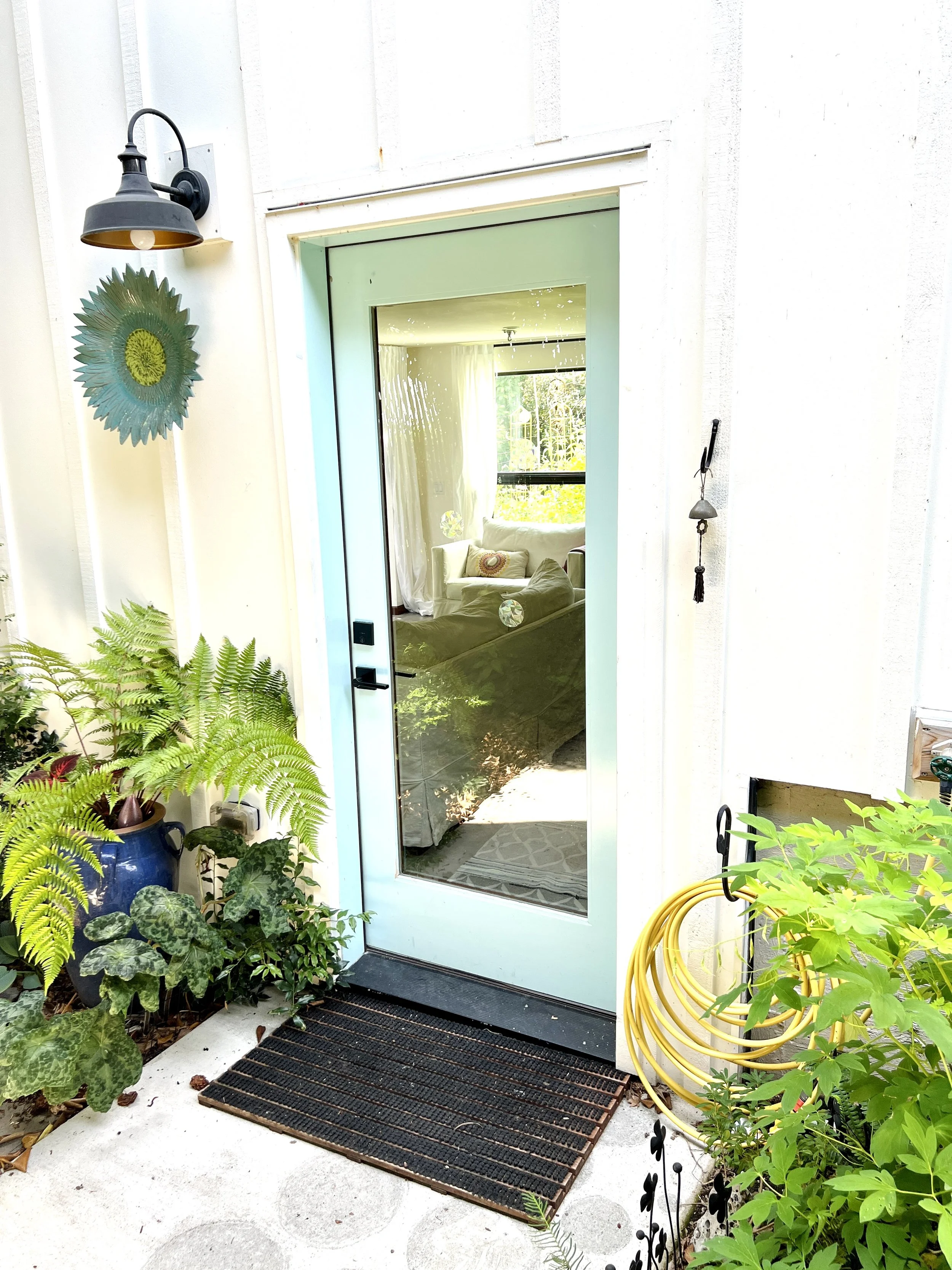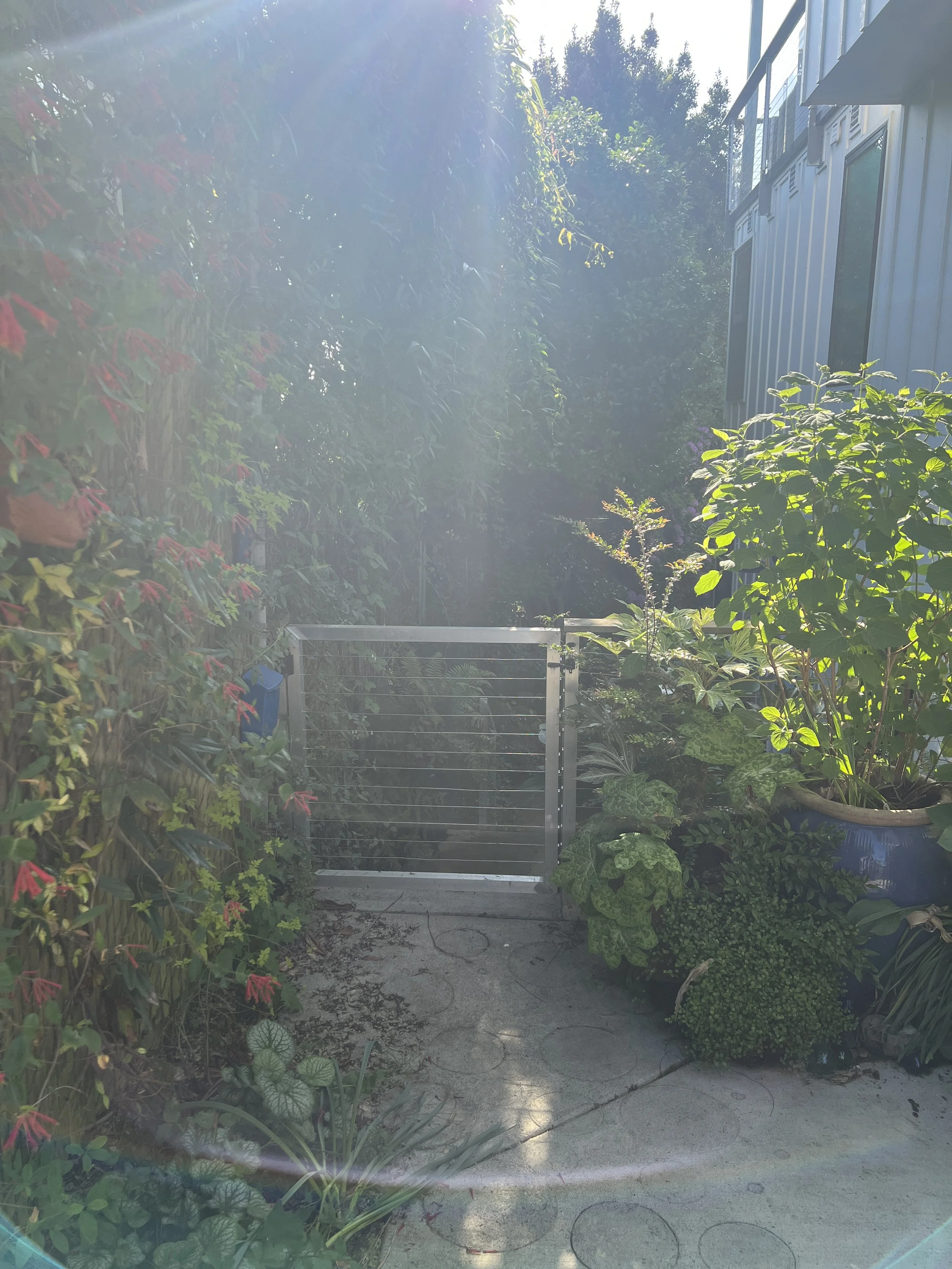 The kitchen window looks out at a small water feature where birds like to take baths. This area is lushly planted with evergreen ferns, a vine wall covering the fence, large camelia tree, and even some plants that bloom in the the winter. The window opens wide for a nice breeze from the north.