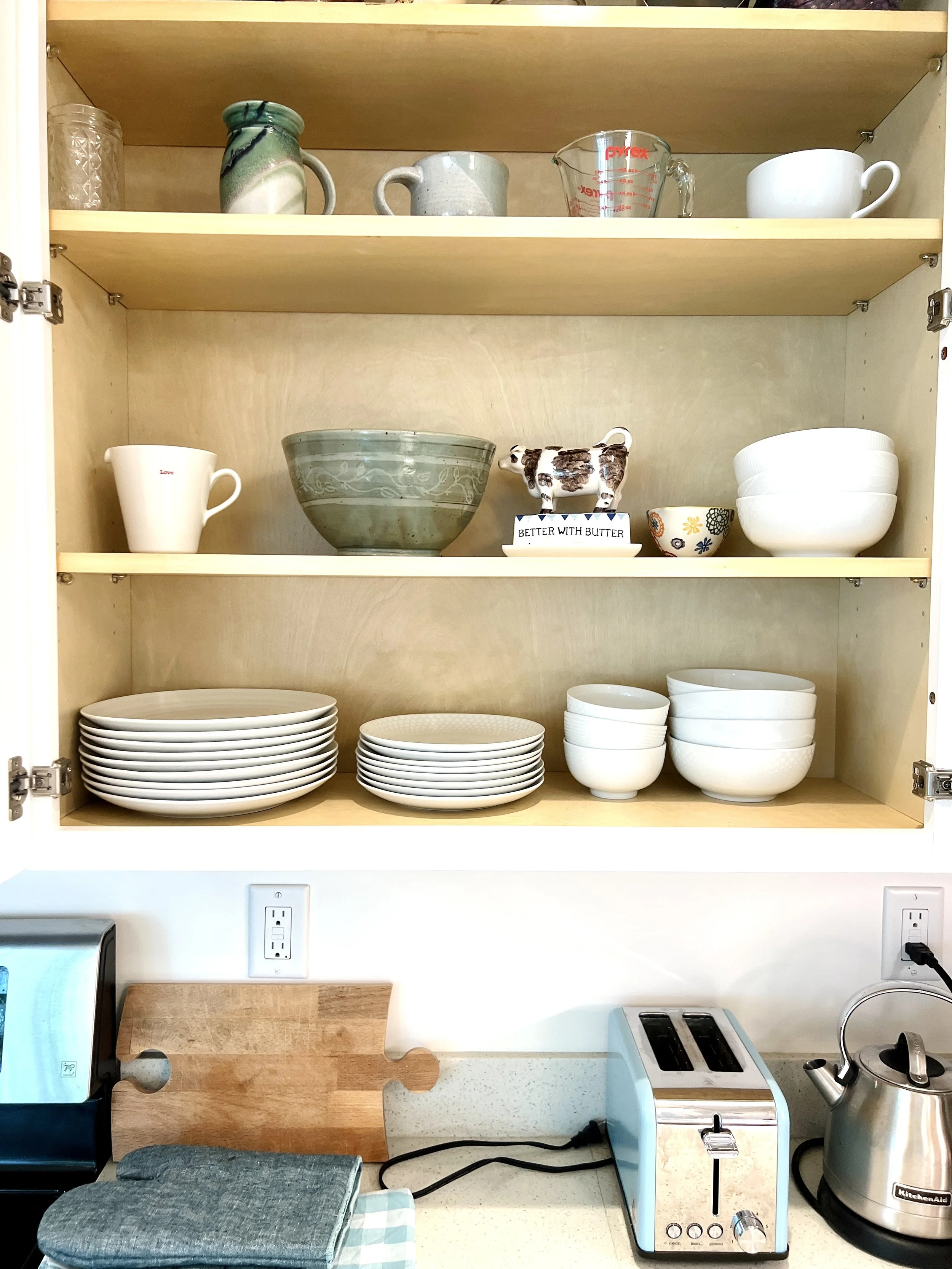 Mikasa plates, plenty of glassware, including wine and martini glasses. We have handmade pottery bowls and mugs from local potter Valentina. Plenty of pots and pans, cookie sheets, muffin pans and more for cooking. And a large assortment of mugs in big and small sizes, some handmade, some from Anthropologie and others from local shops. Any cooking-related item that you don’t see and may need, just call upstairs and I bet we have it. We like a LOT of kitchen supplies but don’t want to clutter the apartment with unusual items like pasta or ice cream machines.