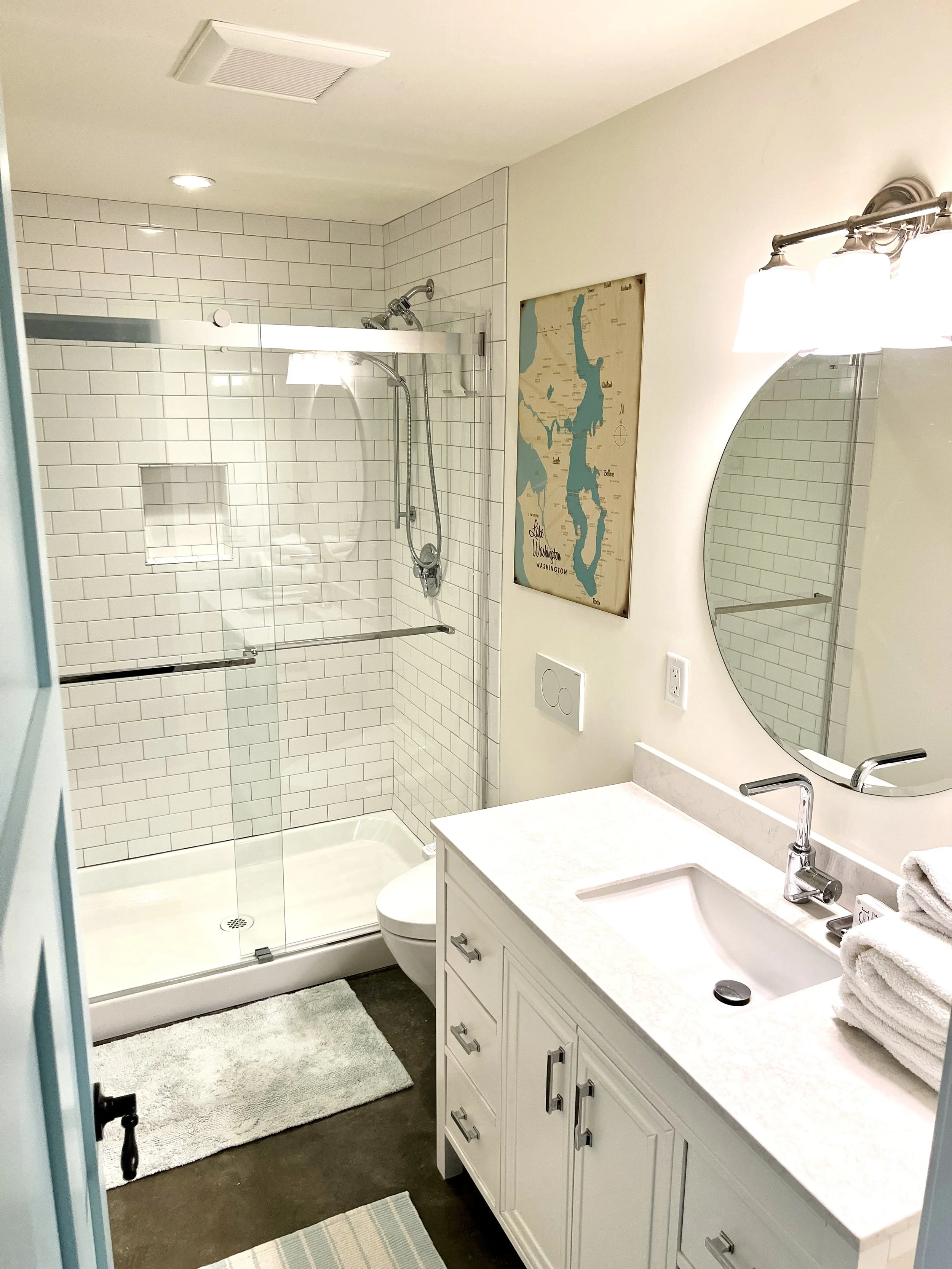 There is an array of ceiling lights on dimmer switches for bright to mood lighting and anywhere in between. Winters in Seattle can be dark, so we designed the apartment to be bright even on drizzly gray days.