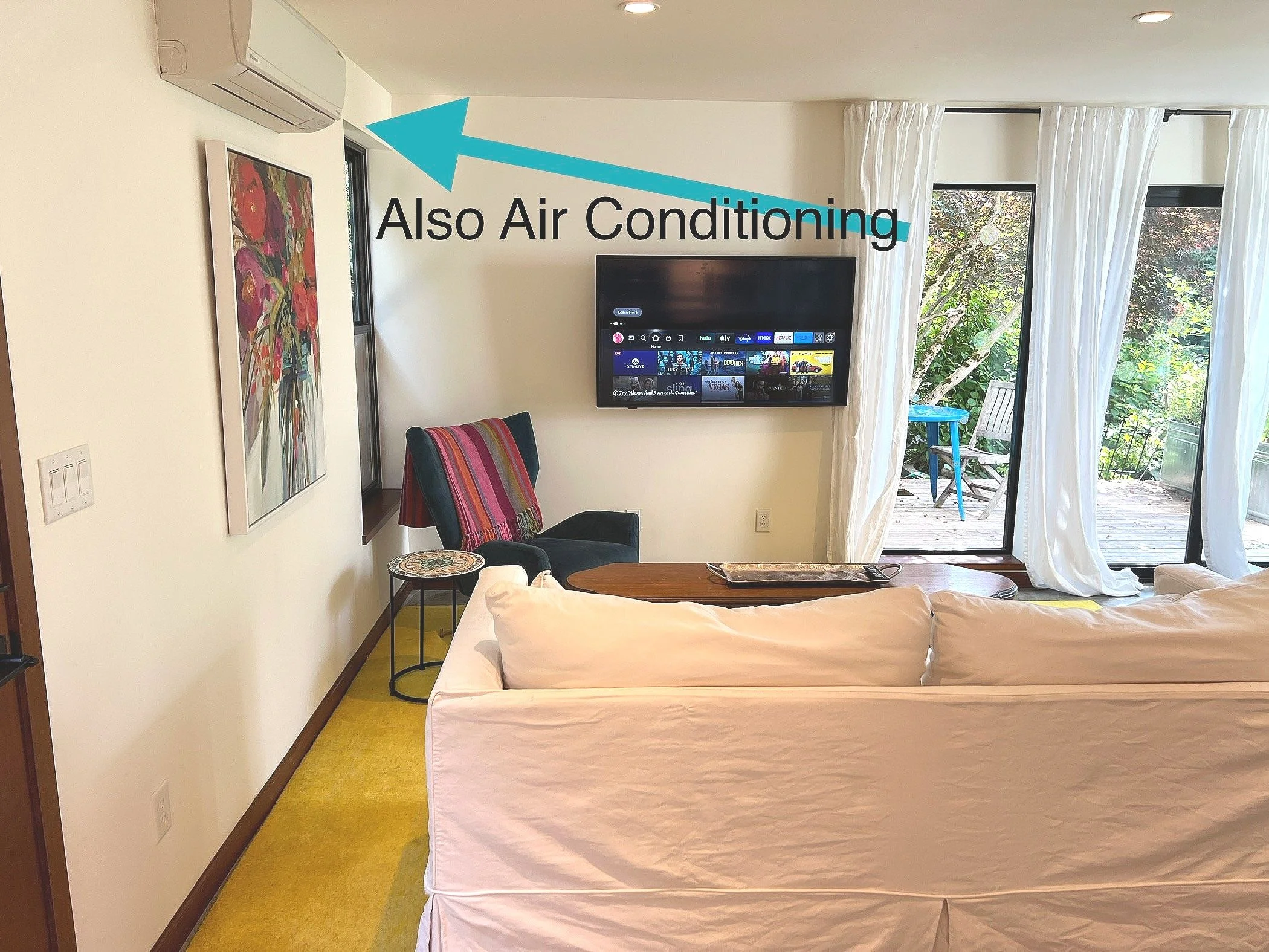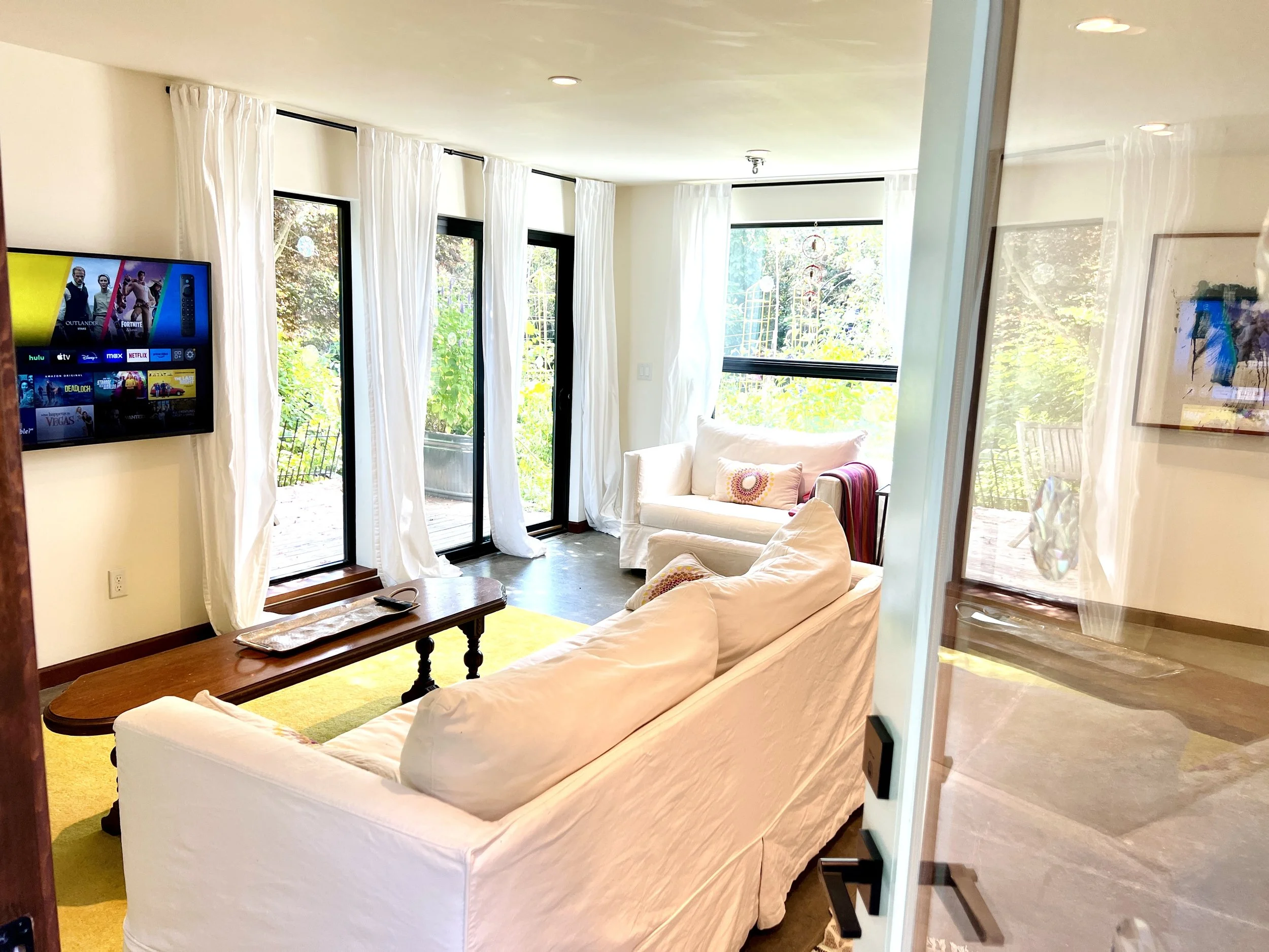 The wall-mounted TV is fully loaded with streaming services. We have Hulu, Apple, HBO, Netflix, Britbox, Acorn and more. It’s a smart TV so if you want to put your own channels on, you can.