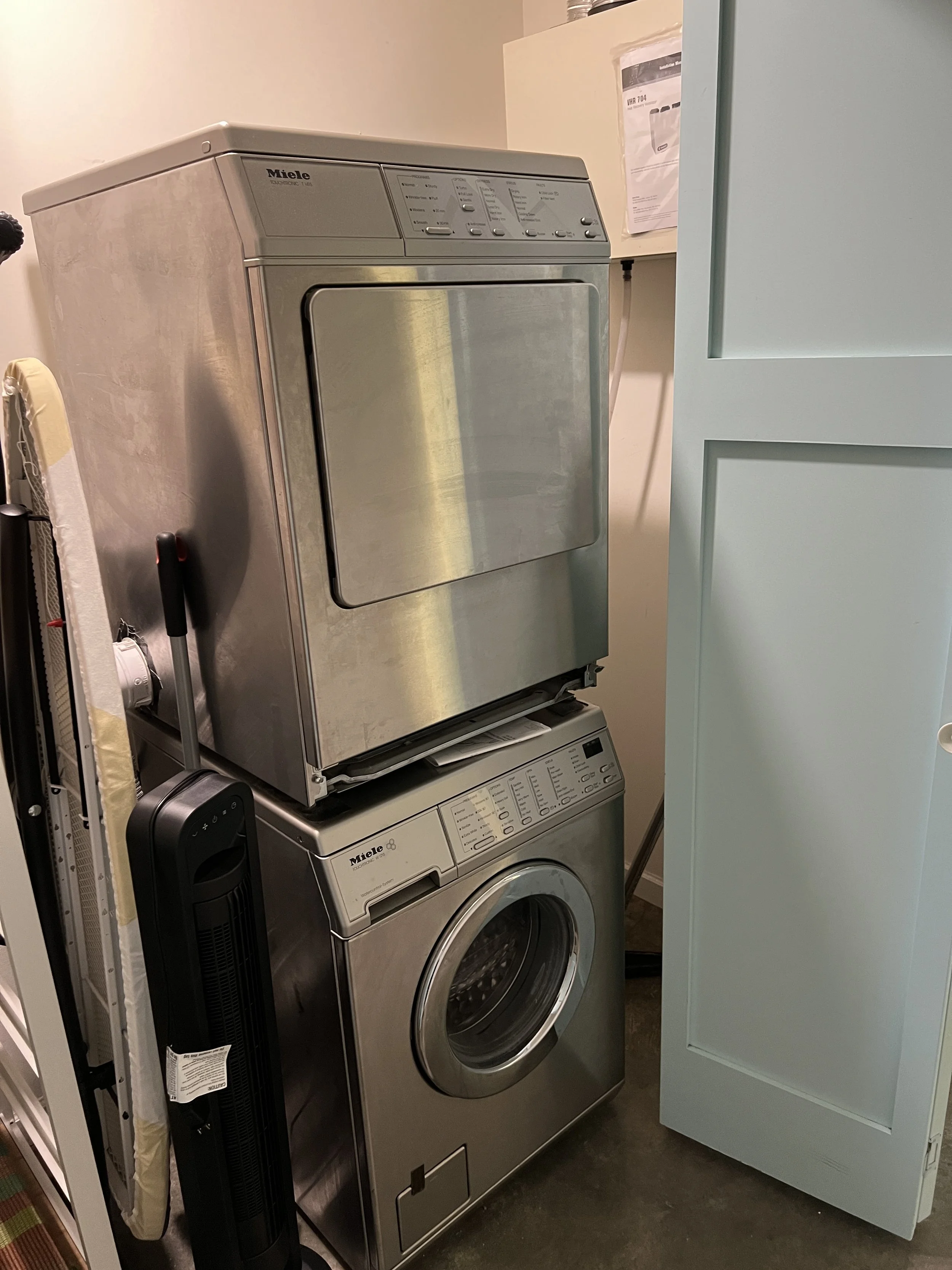In the laundry closet, we have extra sheets towels, blankets and rugs. There is also a short step ladder, a space heater, fan, steam mop, BlueAir hepa air purifier, broom and dustpan.