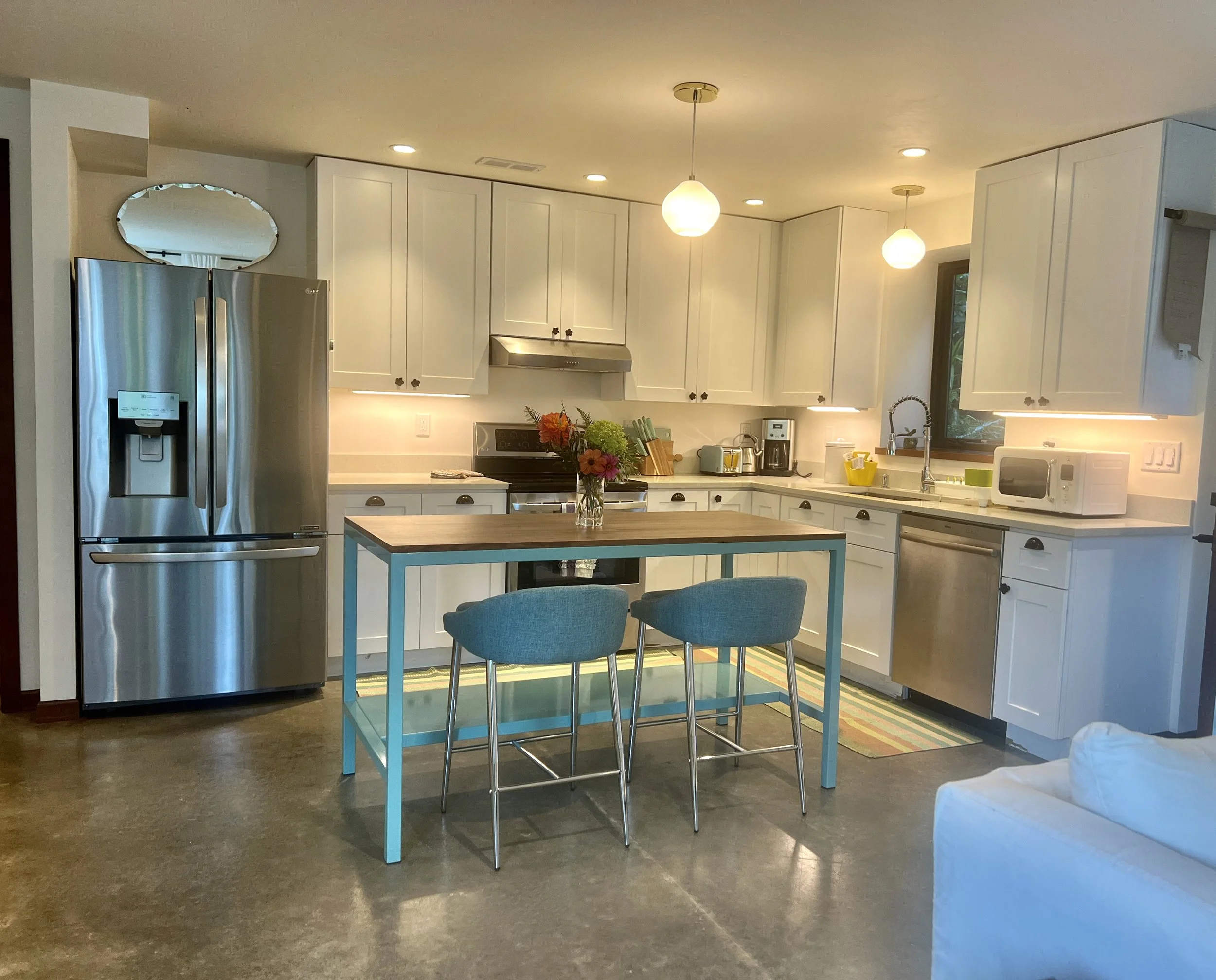Huge new refrigerator with ice and water in the door. Plenty of dishes and all the appliances and pots and pans you need for cooking and baking. There are even vases for bouquets. Dinnerware is Mikasa. Pottery cups are from a local potter, anthropologie and local boutiques.