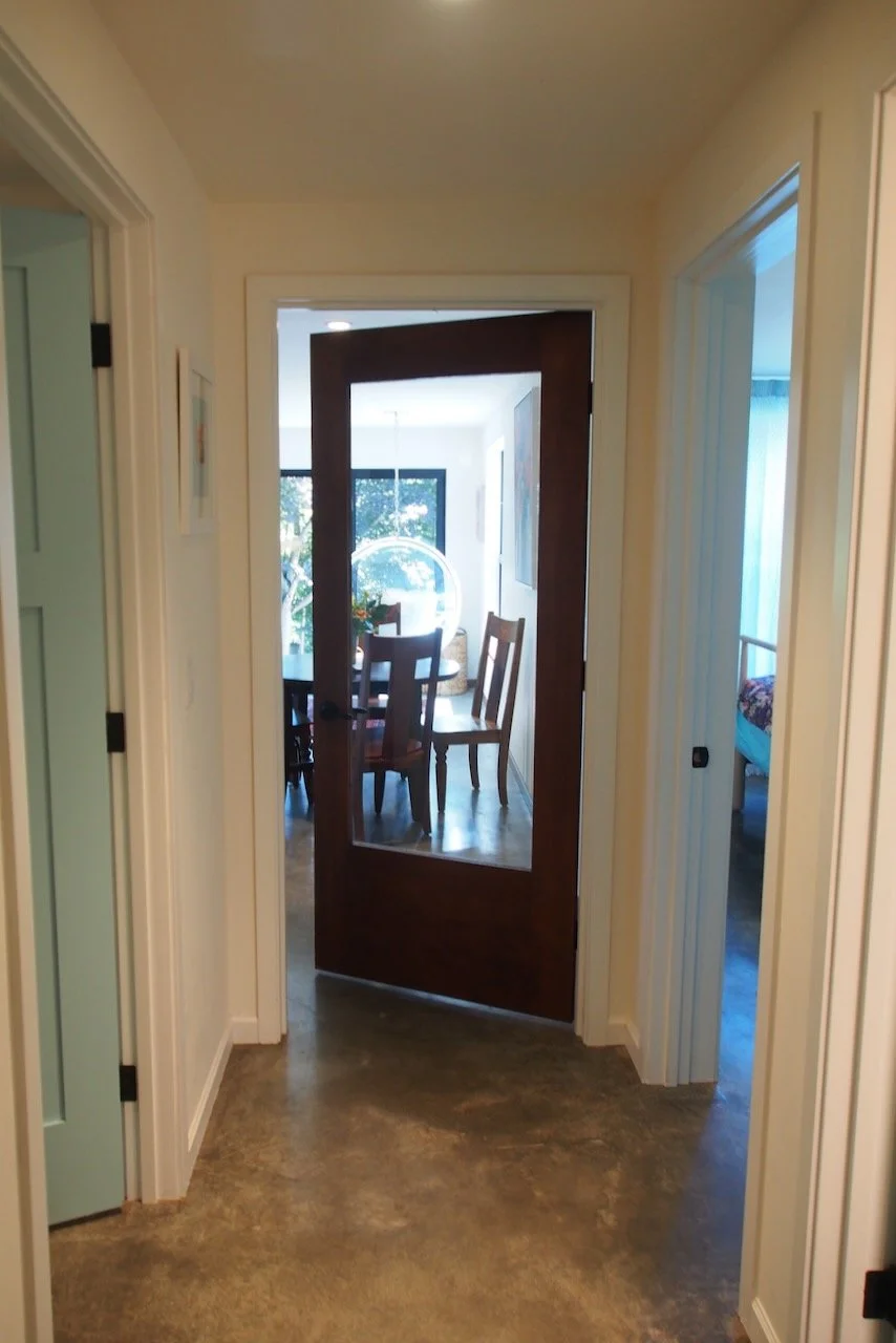 There is an extra hallway door between the living room area and the bedroom area (pictured below) that can help keep the bedrooms quiet while one person is sleeping and another is watching TV or cooking.