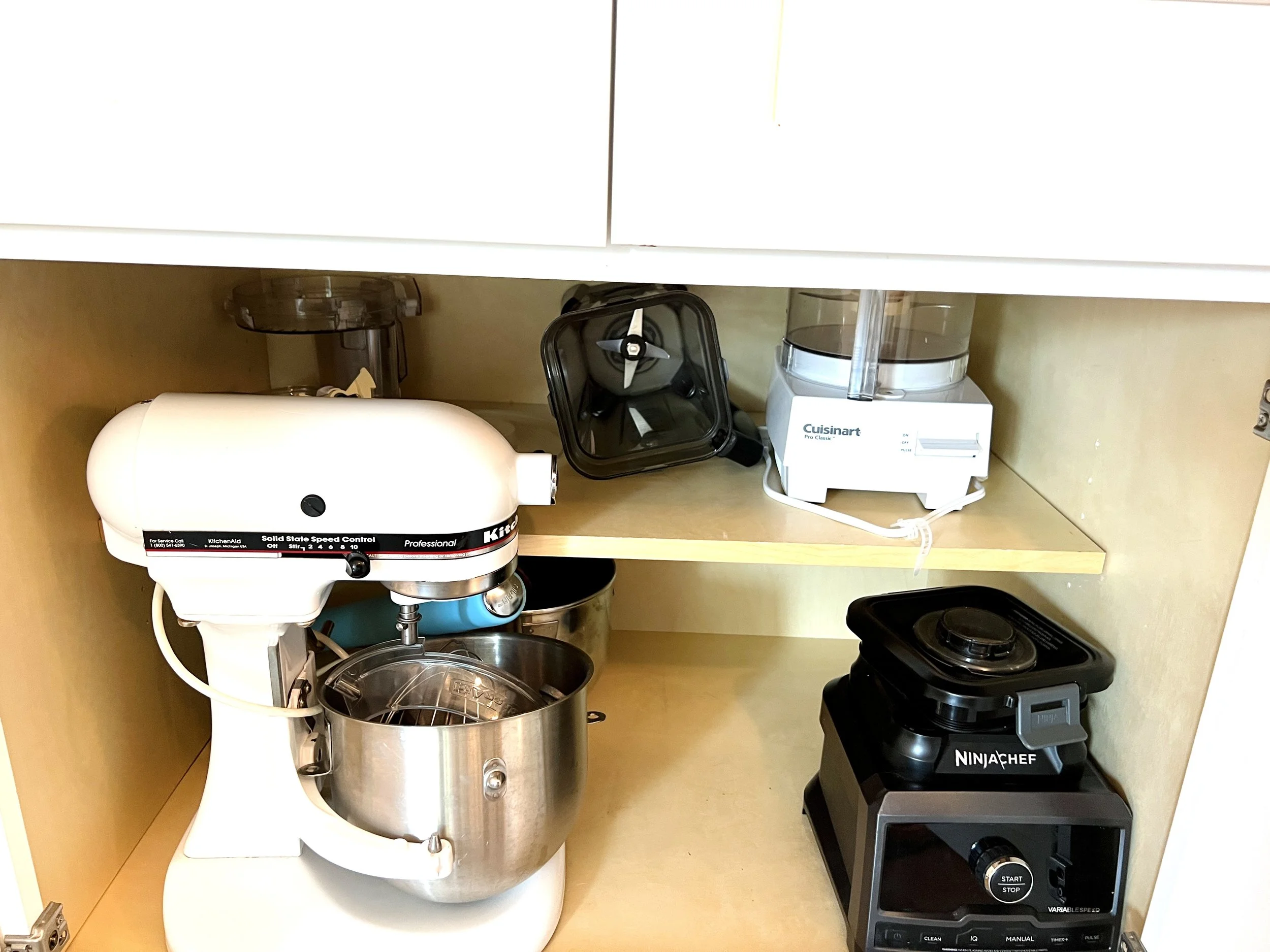 There’s a Cuisinart food processor, Ninja blender and a Kitchenaid mixer in the lower cupboard next to the fridge. On the counter there is an electric kettle, toaster and coffee machine.