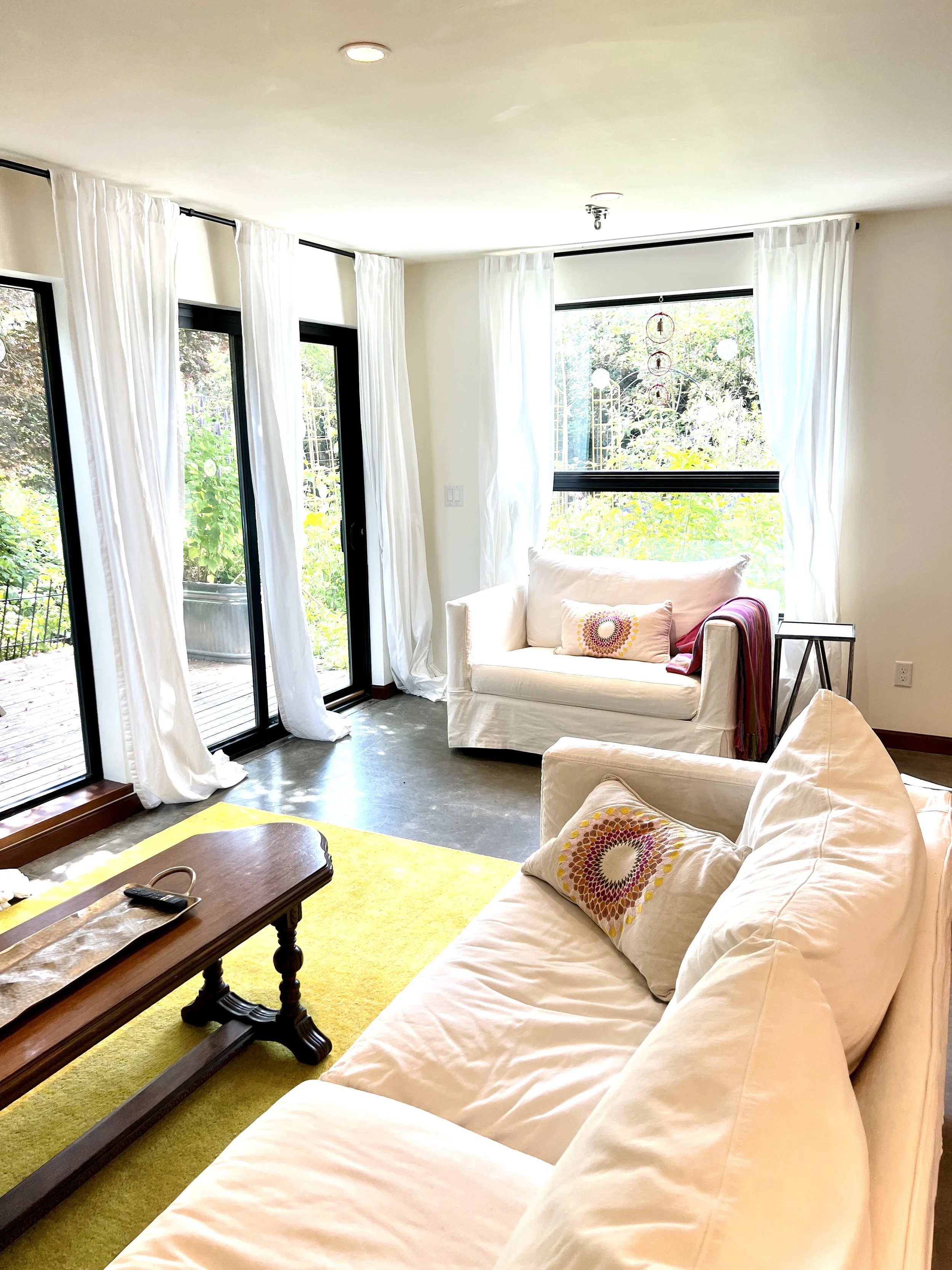 The main room looks out at the garden with windows on three sides, north, east, and south. There’s even a peek-a-boo view of Lake Washington - it’s very peek-a-boo as it is through the neighbor’s fence and across their yard.