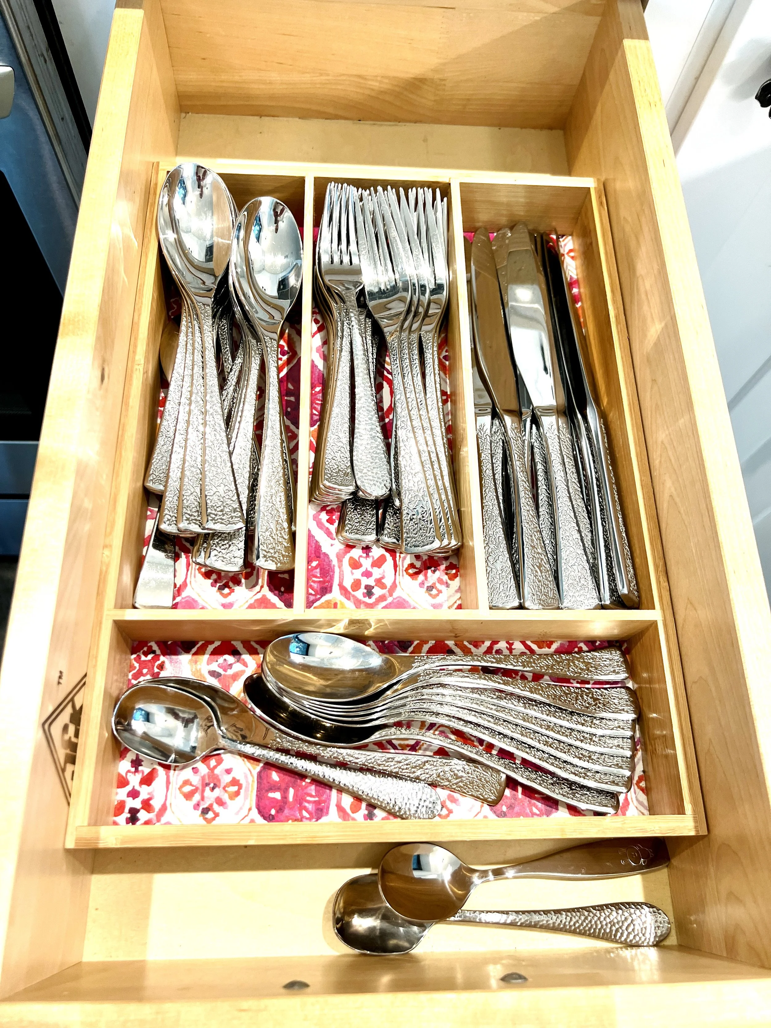 The countertops are quartz, for easy maintenance. The kitchen island has an FSC certified wooden top from Room and Board - we supply lots of cutting boards for slicing, so we can keep the wooden top looking great.